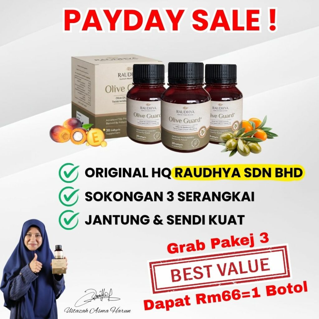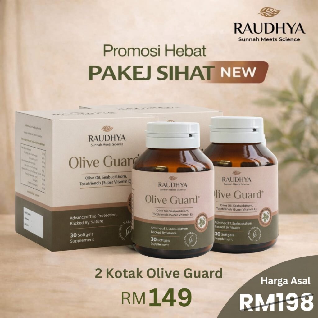 Raudhya OliveGuard+ Diperkaya Bahan Aktif Polyphenols, Tocotrienols (Super Vitamin E) & Omega Aktif Menyokong Kawalan Gula, Kolesterol & Tekanan Darah