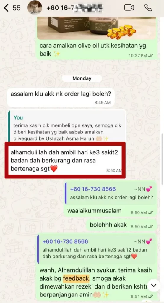 "Baru hari ke-3 dah dapat rasa kesan baik Olive Guard+. Sakit-sakit badan kurang, badan makin bertenaga."