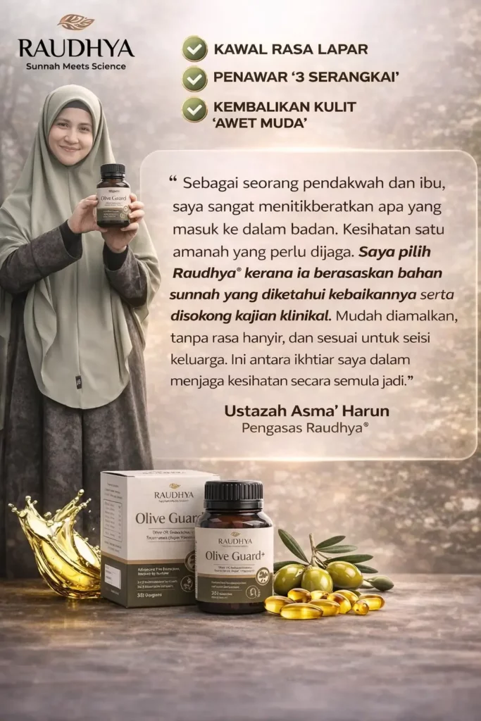 "Dalam Berjuang Dengan Urusan Dakwah Amat Penting Untuk Ustazah Sentiasa Sihat Bertenaga. Sebab Itu Beliau Amalkan Olive Guard+ Raudhya"